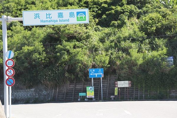 浜比嘉大橋を渡ると、右側「浜」と左側「比嘉」の看板が見えてきます。浜比嘉島に到着です^^